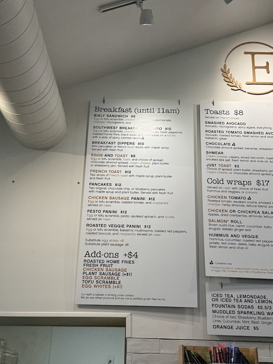Families are well served with a dedicated Kids Menu featuring Kid's Flatbread Pizza, Grilled Cheese, Dippers, Noodles And Sauce, and Mac-N-Cheese (GF). Seasonal creativity appears in the December Specials, including Cranberry And Brie Focaccia Sandwich, Special: Lemon Dill Bialy, Cup Of Root Veggie Bisque (GF/V), Bowl Of Root Veggie Bisque (GF/V), and Regular Peppermint Bark Latte. The Bakery and Bread selections-such as Blueberry Lemon Muffin (GF/V), Brownie (GF/V), Bialy, and Mini Focaccia - GF-round out the experience with thoughtful inclusivity.