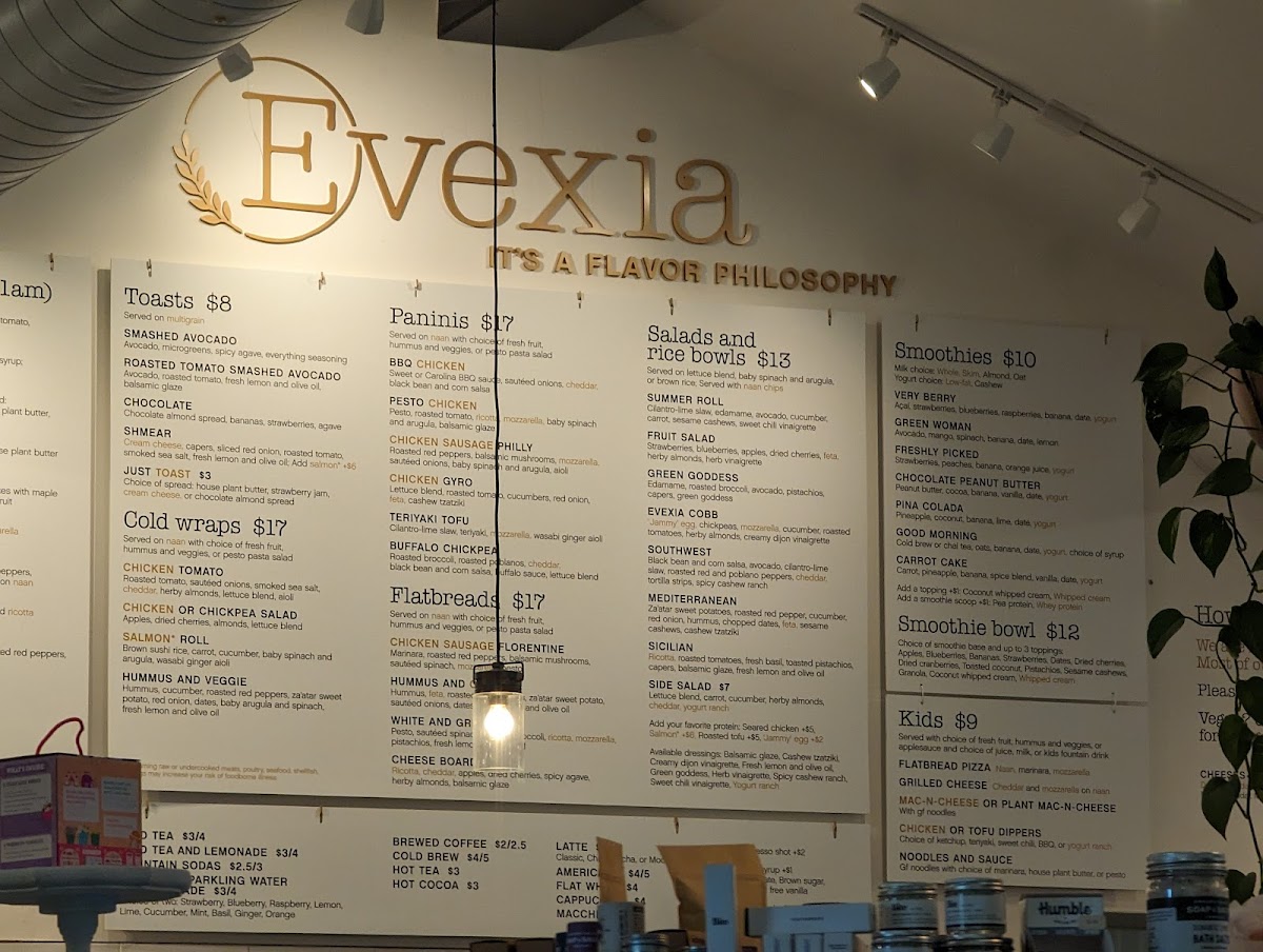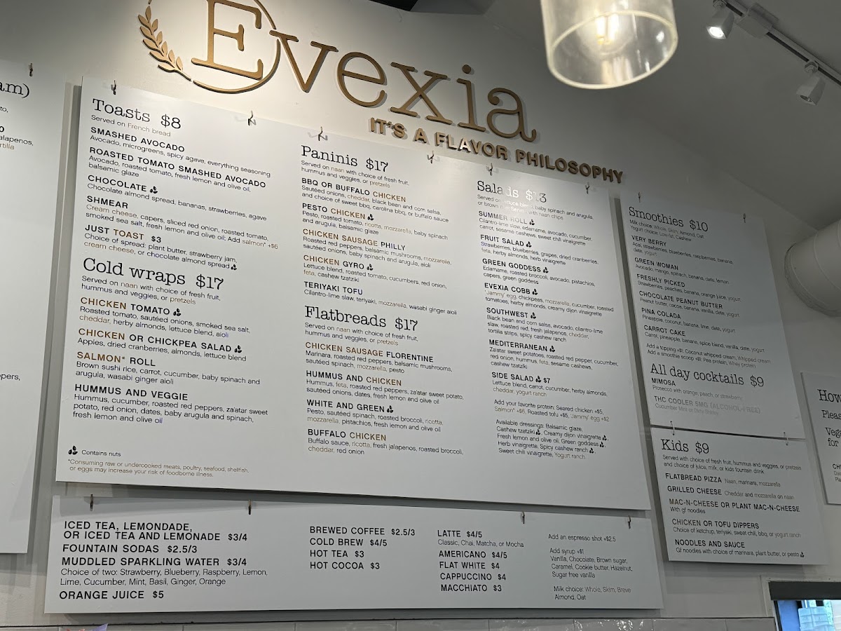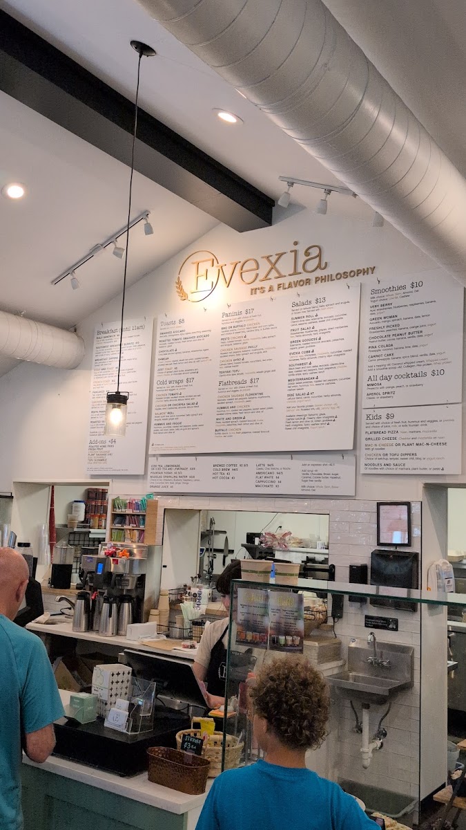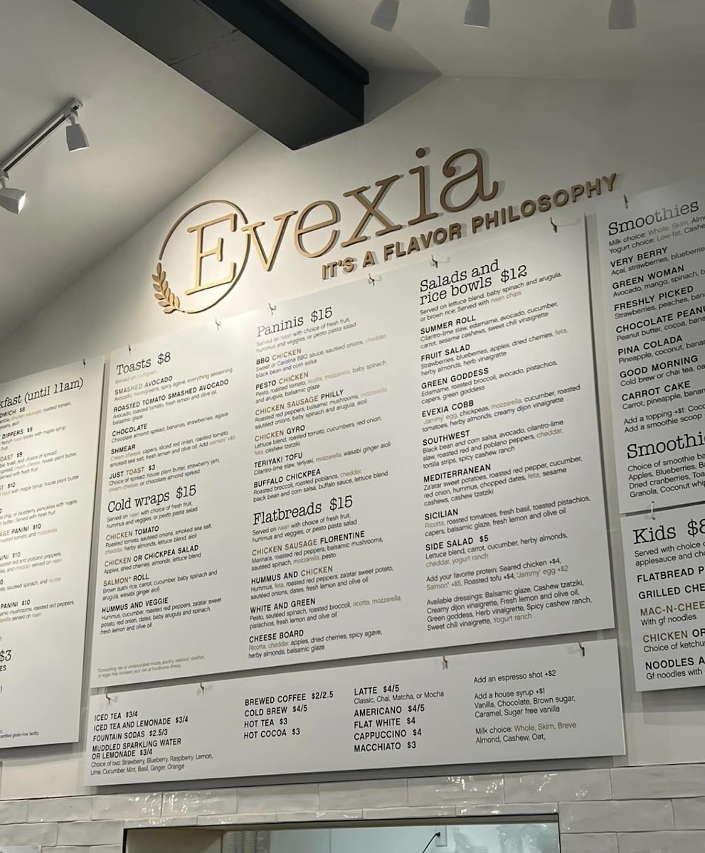 The menu continues to shine with Flatbreads like Chicken Sausage Florentine Flatbread, White & Green Flatbread, Hummus And Chicken Flatbread, and Buffalo Chicken Flatbread, offering shareable plates that feel both indulgent and balanced. For lighter fare, the Salads-notably Summer Roll Salad, Fruit Salad, Green Goddess Salad, Evexia Cobb, and Southwest Salad-reinforce the restaurant’s health-conscious identity. Comfort is not forgotten, thanks to Soups such as Bowl Of Ramen (V, GF), Cup Of Mac And Cheese (GF), Bowl Of Mac And Cheese (GF), Cup Of Plant Mac And Cheese (GF/V), and Bowl Of Plant Mac And Cheese (GF/V).